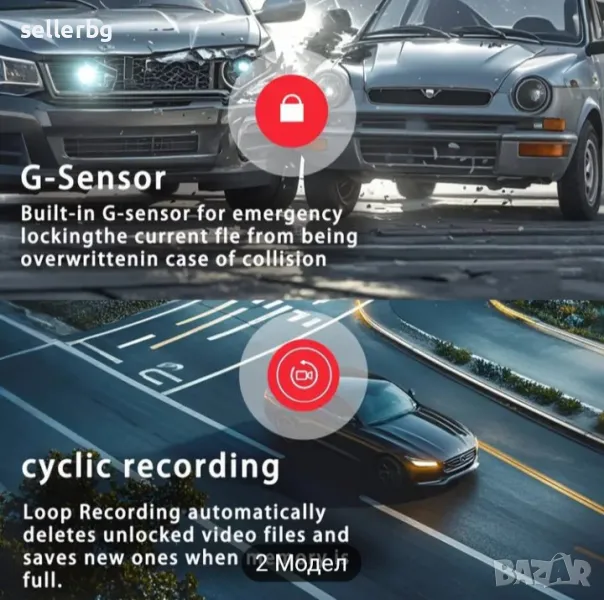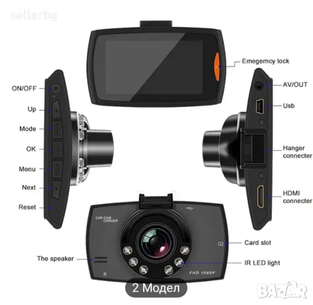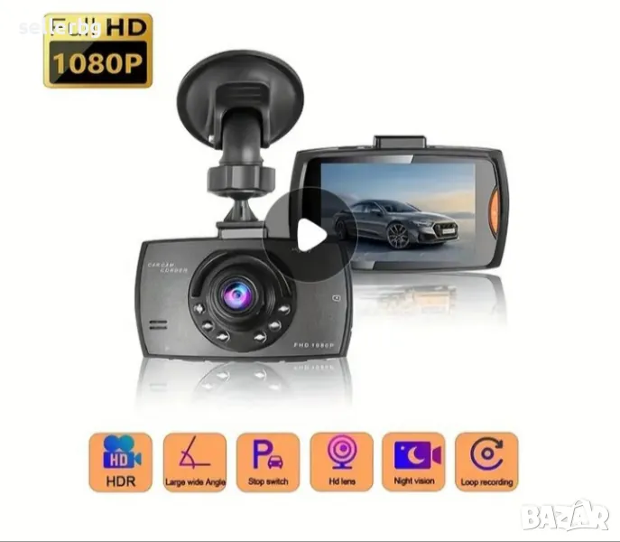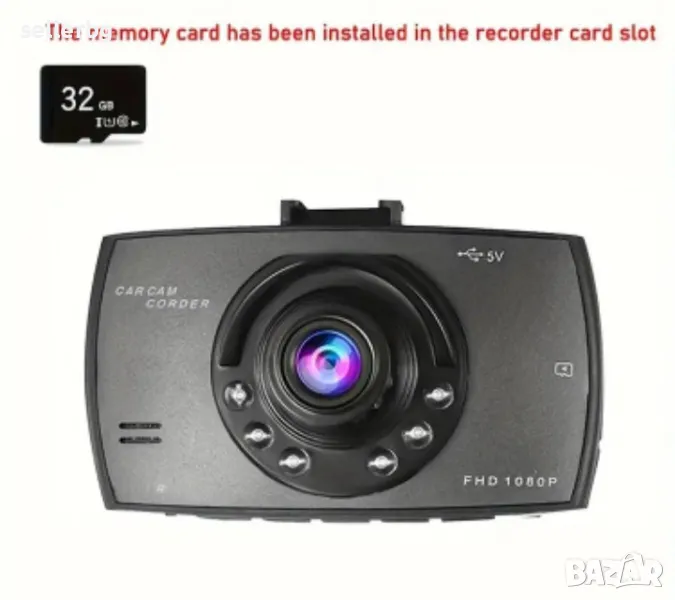 Видеорегистратор HD DVR с 32 Gb карта памет. В комплект със стойка за закрепване към предното стъкло и зарядно с дълъг кабел и щепсел към запалката на ввтомобила (работи от 8 до 24 волта и е съвместим с мрежата на леки и товарни автомобили).
