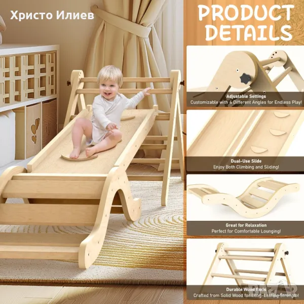 УНИВЕРСАЛЕН КОМПЛЕКТ ЗА ИГРА MONTESORI Този комплект "всичко в едно" включва стълба за катерене, имитация на стена за катерене, пързалка, катерушка с лък и постелка. Той е предназначен да насърчава физическото развитие, баланса, координацията и семейните връзки, което го прави перфектният подарък за малки деца.