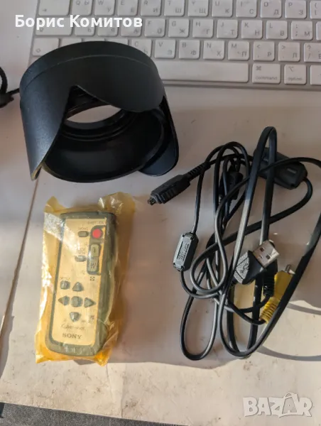 карта с памет, зарядно, универсален кабел, лента за рамо, капачка за обектива, лента за капачката, сенник-цвете, безжично дистанционно, адаптерен пръстен, чанта.