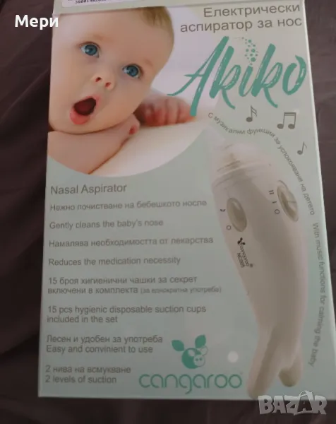 Характеристики:Комплектът включва:15 бр. еднократни хигиенични чашки за секрет;1 бр. универсален силиконов накрайник;1 бр. резервен силиконов уплътняващ пръстен;2 нива на всмукване;Музикални опции.Аспираторът Akiko предлага едновременно удобство за бебчето и майката и хигиена. С него носната бебешка кухина ще бъде винаги чиста.Ползването му е изключително лесно.Детайли за продукта2 нива на всмукване;Максимална сила на всмукване: 58 кРа;Музикални функции;Контролира се с помощта на бутони;Изработен от полипропилен;Без ВРА.За ползването на уреда са необходими Получавате15 броя еднократни хигиенични чашки за секрета;1 брой универсален силиконов накрайник;1 брой резервен силиконов уплътняващ пръстен.Cangaroo е една от най-продаваните и харесвани марки за бебешки и детски стоки, която предлага изключително разнообразие от стоки на много добри цени. Марката предлага удобство и комфорт за Вас и Вашето дете.