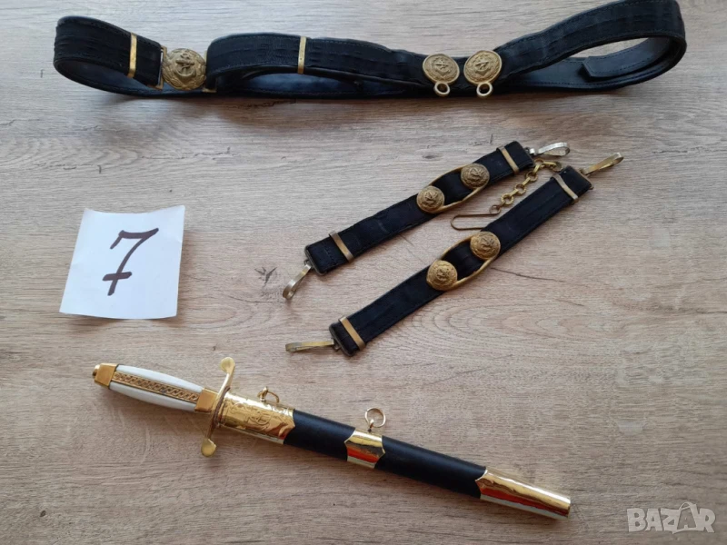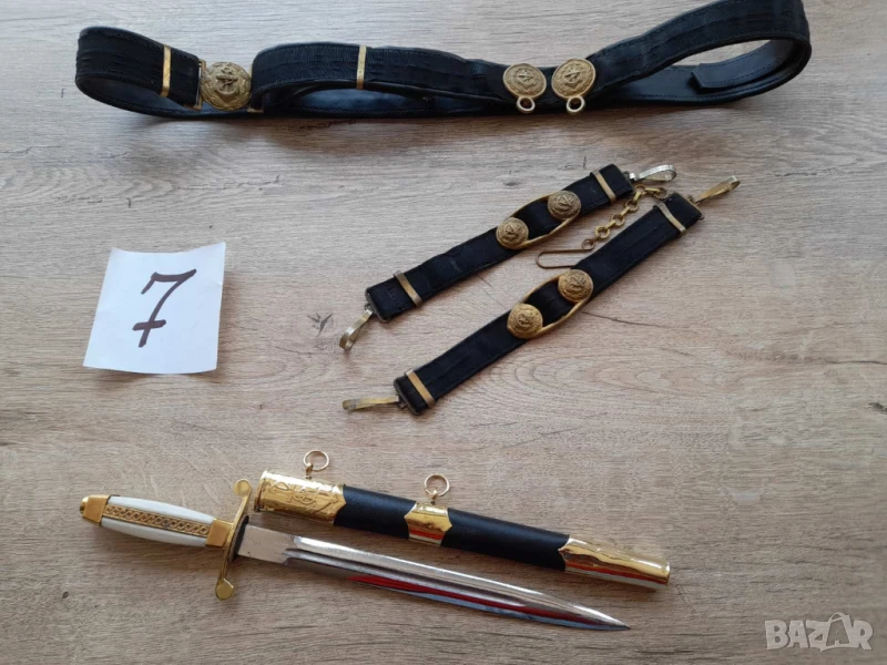 Кортик на Военноморския флот образец 1951г ПЪРВА ЕМИСИЯ автентичен. Колана и носачите са изработени от черна рипсена лента, подплатена с черна изкуствена кожа. Снимките показват всички детайли, въпроси по телефона.