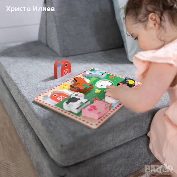 Забавлявайте се във фермата с този изключително масивен дървен пъзел. Той включва седем лесни за хващане, масивни селскостопански животни плюс масивна плевня. Всяко парче има пълноцветна, съответстваща снимка отдолу. Фигурите на плевнята и животните стоят изправени за игра с преструвки. Насърчава уменията за ръчно око, фината моторика и творческите умения за изразяване.