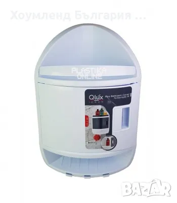 Ъглова етажерка за баня с удобни отделения. Шкафче за баня с ъглов дизайн с вратичка и закачалки в долната част на еатжерката.