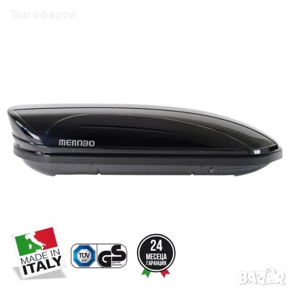 Автобокс Menabo Mania със страхотна аеродинамична форма, стилен цвят и обем от 400L, за да побере целия ви багаж.