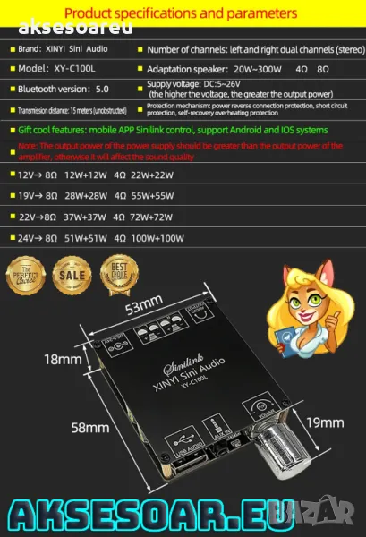 Име на продукта: Двуканален Hi-Fi стерео усилвател на платка с Bluetooth 5.0 AUX jack и USB audio port