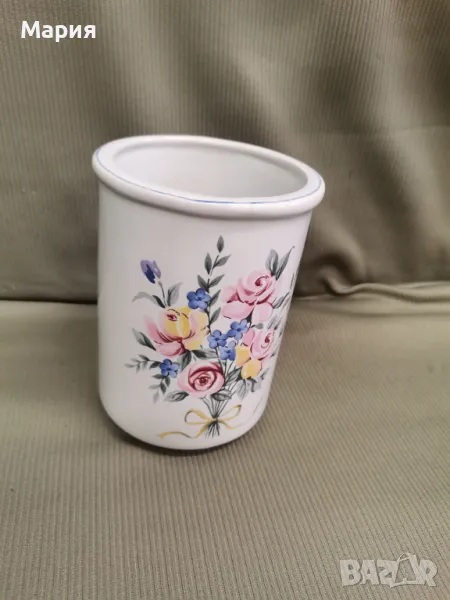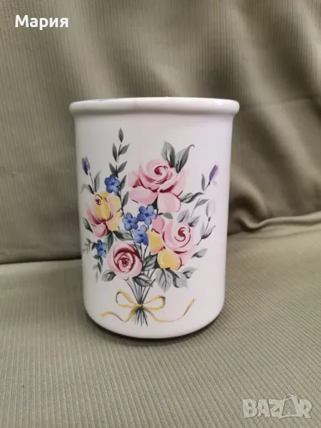 Порцеланова поставка за кухненски прибори. Чудно нежен флорален декор. Размери височина 16см.,диаметър 11см. Отлично състояние. Цена 32лв.