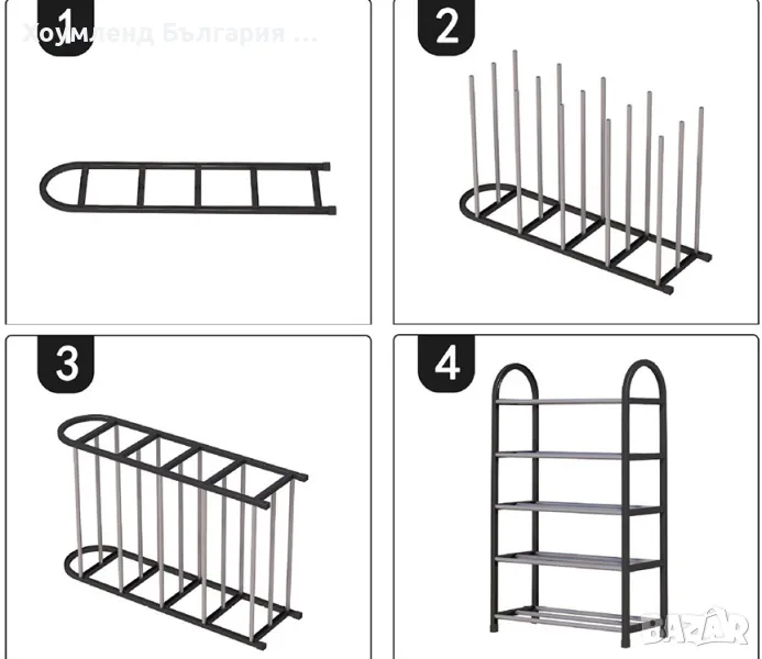 Стелажът за обувки е издържлив и стабилен. Изработен със стабилна конструкция от закалена пластмаса с метални тръби, които образуват рафтчета. Сглобява се бързо и лесно.