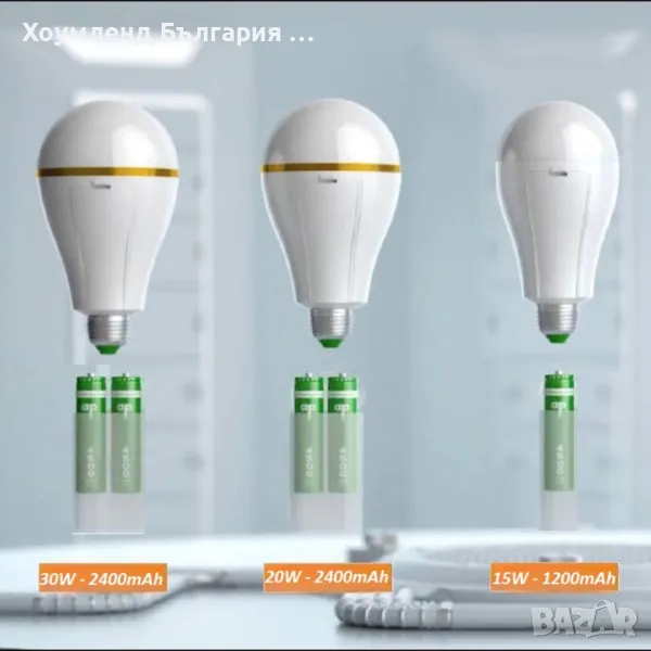 Крушката от 15W притежава презаредима батерия 1200mAh, а модел, а тези от 20 и 30 вата с с по две батерии (общо 2400mAh)