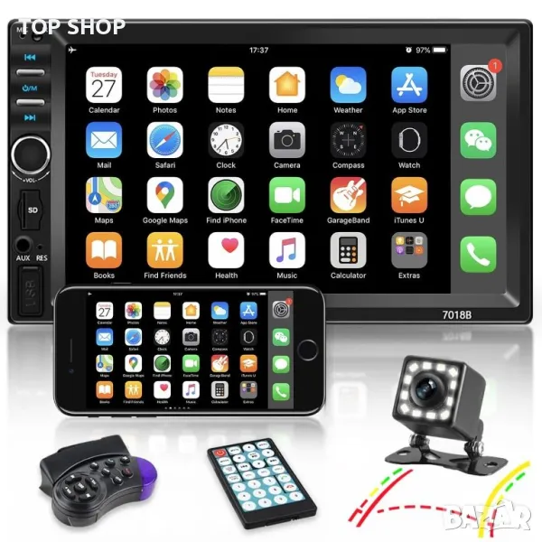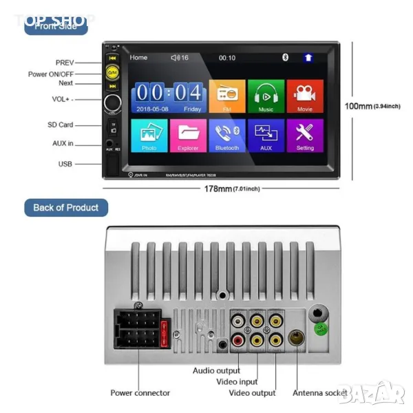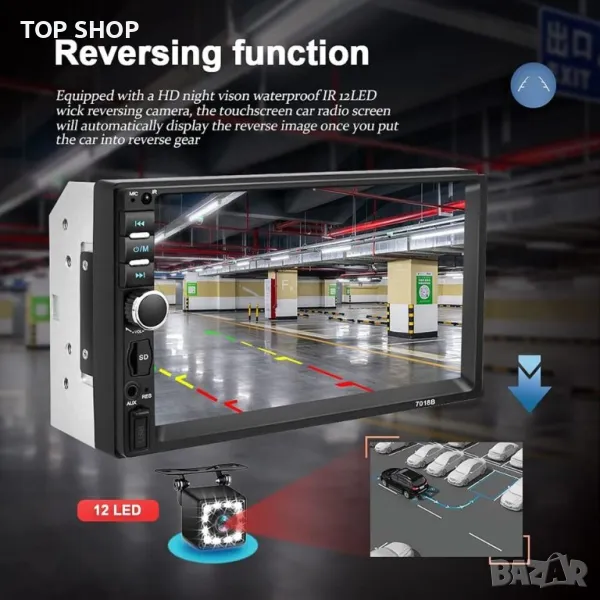 Какво има в кутията: 1 x Double Din стерео уредба за кола 1 x Захранващ кабел 1 x Кабел за високоговорители 1 x Ръководство за потребителя 1 x Дистанционно управление 1 x 12led резервна камера Акценти на продукта: ● 24-битов DAC, качество на звука с високо прецизна редукция ● Поддръжка на APE, FLAC, WAV, DIS аудио формати без загуби, поддържат висок битрейт! Качество на звука до трескаво ниво Ниво на CD ● Поддръжка на 24-битов 96 KHz WAV формат, по-висока музикална резолюция от CD ● Изцяло нов чипсет за обработка (CPU), по-бърза реакция, по-стабилна производителност, по-мощни функции ● Разнообразие от настройка на звука (SEL): електронен обем, високи честоти, бас, ляв и десен баланс, предно и задно звуково поле ● Хардуерна обработка на електронен звук (EQ), разнообразие от аудио режими, високи и ниски тонове могат да се регулират ● Поддръжка на Bluetooth/микрофон/контрол на волана ● С HD водоустойчив резервна камера за нощно виждане ● Пълно електронно цифрово радио търсене, високоефективна цифрова настройка FM радио автоматично сканиране, 18 радио съхранение ● Поддръжка на Android/Iphone Mirror Link, Android телефон може да реализира двупосочен контрол, Iphone може да реализира еднопосочен контрол