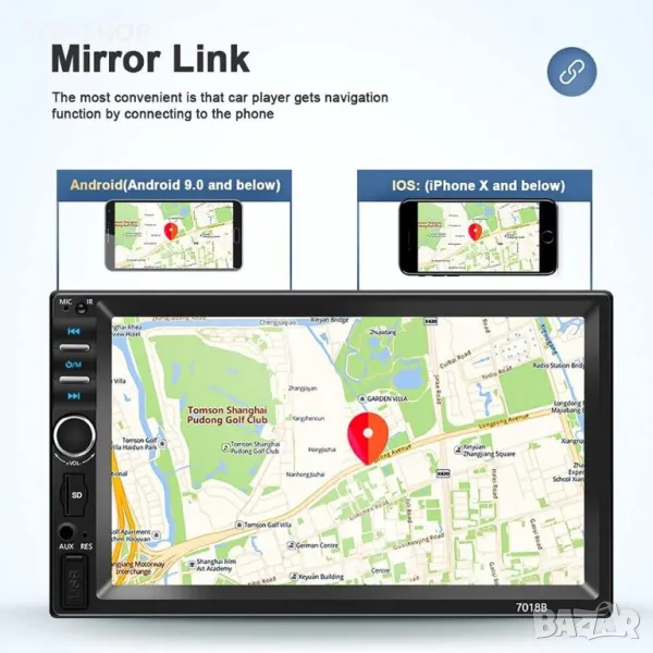 Mirror Link за Android/Iphone Свържете телефона си към стереоуредбата на колата чрез оригинален кабел за данни, стереоуредбата на колата ще показва съдържанието от екрана на вашия мобилен телефон синхронно. Най-удобното е, че плейърът за кола получава функция за навигация, като се свърже с телефона, зарежда телефона едновременно. (Поддържа Android 9.0 и по-стари, iPhone X и по-стари)
