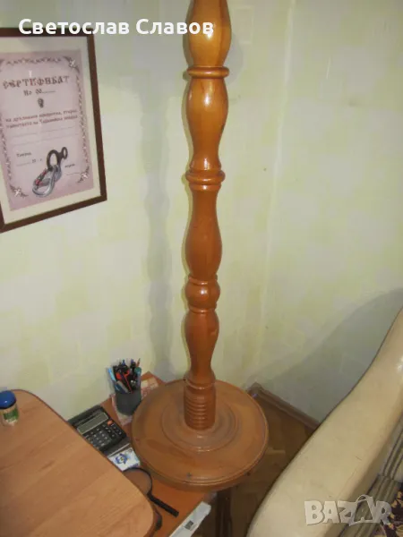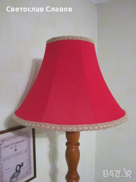 Лампионът е с красива червена шапка, висок е 150 см. Шапката на лампиона е висока 38 см с горен диаметър 22 см. и долен 52 см. Цвететът й е червен с украсителни ширити в цвят екрю по кантовете. Стойката на лампиона е от масивно струговано дърво - червен американски дъб. Всички стойки на лампионите и настолните лампи са изработени лично от мен ! Могат да се правят всякакви комбинации между стойките на лампионите и шапките за тях като това няма да промени обявената им цена !