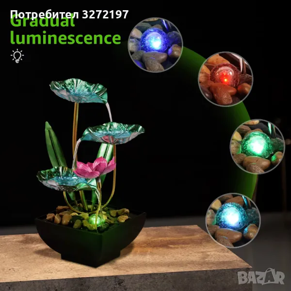 Меки светлини, пречупени от течащата вода, създавайки романтична атмосфера за вашето пространство. Къркането на водата може да повиши влажността на въздуха в помещението.