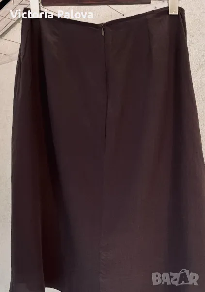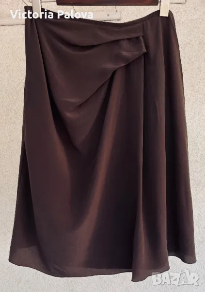 Талия - 37см, дължина - 62см, ханш - 56см. Полата е с много красива драпировка, цип отзад, има подплата. Материята е летяща коприна, цветът е актуален - шоколад.