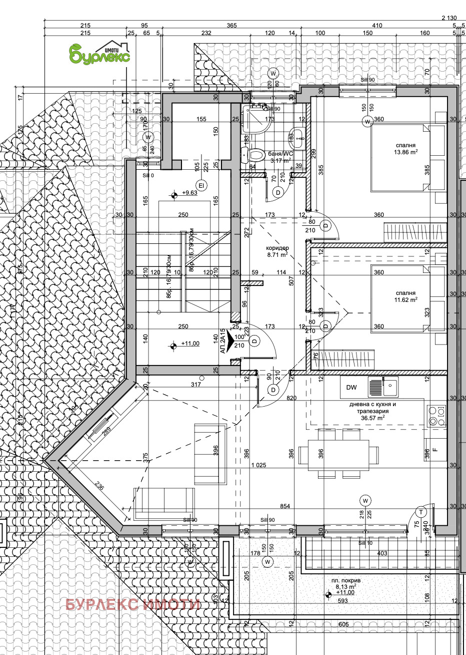 БУРЛЕКС ИМОТИ Ви предлага за продажба завършен по БДС тристаен апартамент на пети етаж в новопостроена сграда с асансьор.Жилището е с обща площ 108,75 кв.м. и се състои от дневна с кухня и трапезария 36,57 кв.м., родителска спалня 13,86 кв.м., детска спалня 11,62 кв.м., баня с тоалетна 3,17 кв.м., коридор и тераса.