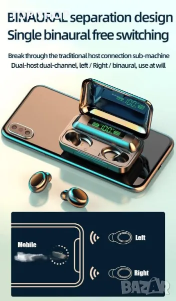 Безжичните слушалки TWS F9 автоматично влизат в режим на търсене на Bluetooth устройство, когато бъдат извадени от кутията за зареждане. Слушалките са съвместими с всички Bluetooth устройства със системи Android, IOS и Windows, независимо дали става въпрос за таблет, смартфон или лаптоп.