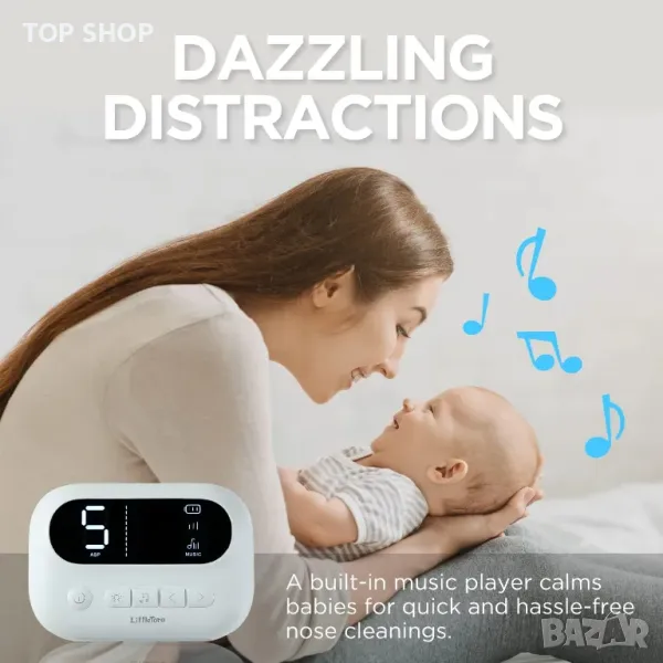 Сложете край на силния плач и пристъпите на гняв с вградения музикален плейър, който възпроизвежда познати и релаксиращи мелодии, за да занимава вашето бебе, докато почиствате малките им носове.