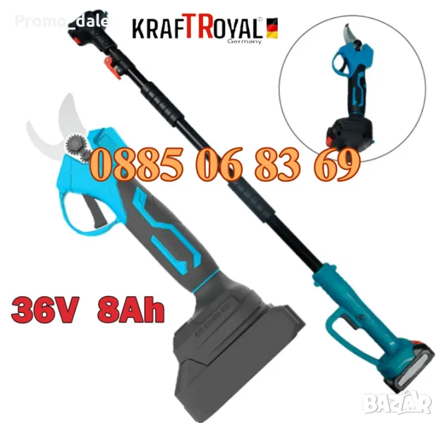 Комплект от акумулаторна лозарска ножица и телескопичен прът 2 в 1 36V 8Ah