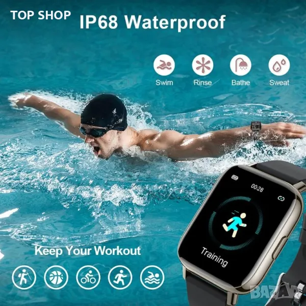 IP68 Водоустойчив фитнес смарт часовник и 7 дни живот на батерията: Водоустойчивият часовник е проектиран с IP68 водоустойчив рейтинг, можете да го носите в много случаи без притеснения, като упражнения, миене на ръце, игра под дъжда и т.н. (забележка: смарт часовникът не пречи топла вода и морска вода.) Часовникът с bluetooth отнема само 1,5 часа за зареждане и може да се използва 7 дни или 30 дни в режим на готовност, много по-дълго от повечето традиционни часовници.