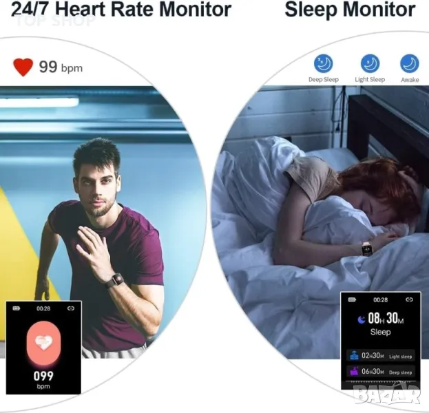 Монитор на сърдечния ритъм и проследяване на съня: Часовникът за кръвно налягане може автоматично да следи сърдечния ви ритъм през целия ден и да измерва кръвното налягане и кислорода в кръвта, които са най-критичните показатели за здравето на тялото. Часовникът за проследяване на фитнес може също така да следи състоянието на вашия сън (дълбок сън, повърхностен сън, събуждане) и да предостави цялостен анализ на качеството на съня, за да ви помогне да станете по-здрави. Всички тези данни ще ви помогнат да живеете по-здравословен живот. (данните не могат да се използват като медицински тест.)