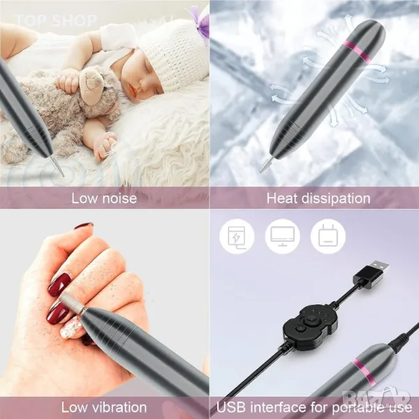 електрическа пила за нокти Moseen Heal е оборудвана с първокласни лагери, които могат да намалят нестабилността по време на въртене, ефективно да намалят вибрациите и шума, причинени от полиране на ноктите. Тялото от алуминиева сплав с висока плътност ефективно предотвратява генерирането на топлина, а противоплъзгащият дизайн на върха спомага за здравото захващане. Всички тези подробности гарантират по-добро потребителско изживяване. Опитайте Moseen Heal, тогава няма да ви подведем.