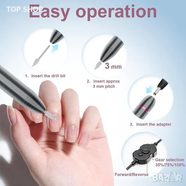 【30-минутна система за автоматично изключване】Нашата преносима бормашина за нокти има система за автоматична защита, която кара бормашината да спре да работи автоматично след 30 минути работа и можете да я включите отново, ако е необходимо. Системата може ефективно да помогне за пестене на енергия, да предпази двигателя от претоварване