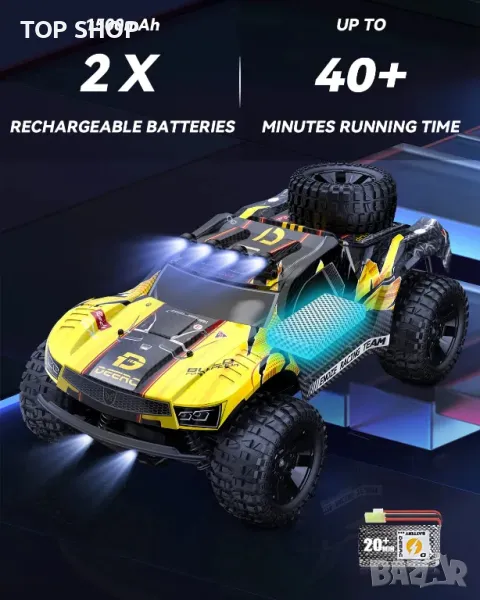 【2 БАТЕРИИ & 40+ минути време за игра】 RC колата е оборудвана с две висококачествени акумулаторни батерии от 1200 mAh, можете да се насладите на забавлението от шофирането за около 40+ минути наведнъж (20+ минути за всяка батерия). Само с едно шофиране ще разберете защо производителността на нашите камиони с кратък курс е на съвсем ново ниво.