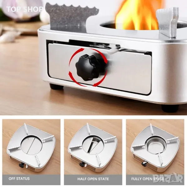 Лесно регулиране на силата на огъня: Капакът има дълга дръжка за регулиране на силата на огъня и гасене на пламъка, без да докосвате огъня. Можете лесно да регулирате силата на пламъка, като плъзнете капака и можете да регулирате размера на пламъка, за да пасне на предмета, който поставяте