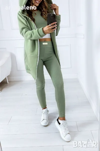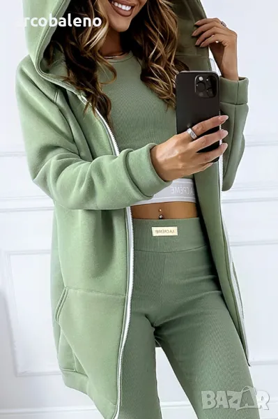 Открийте уникален комплект, състоящ се от дълъг изолиран суичър с просторна качулка, клин и горнище с ластик с лого. Суичърът осигурява топлина и комфорт, горнището и клинът пасват идеално на фигурата. Перфектният избор за пролетните и есенни дни!
