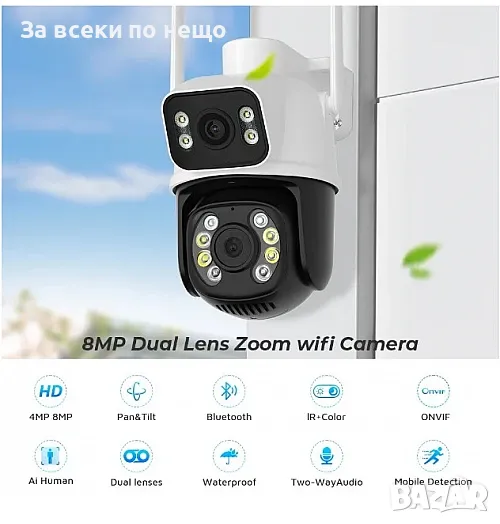 Следете всичко през смартфона си едновременно в две посоки с Двойна външна Wi-Fi PTZ камера iCasee за наблюдение през телефона с висококачествена 4К резолюция и 8MP камера. Осигурява широкоспектърно двупосочно видеонаблюдение с висококачествена резолюция и получаване на известие на телефона. Ваше верен охранител, когато не сте у дома.