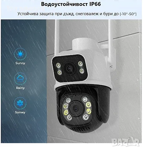 Водоустойчив корпус IP66 - двойната Wi-fi PTZ камера е създадена за външно наблюдение, но може да се използва и на закрито. Корпусът и е устойчив на атмосферни условия (дъжд, сняг, виелици, прахови бури) с най-висок клас защита сертификат IP66;