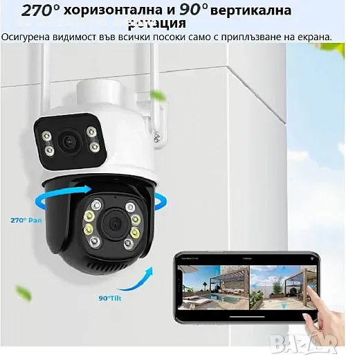 Двупосочно видеонаблюдение – едно устройство но с две камери позволява да 360 градусово наблюдение във всички посоки, БЕЗ риск от скрити действия! PTZ камерата представлява няколко компонента. Стойка, на която се фиксира към стена или греда. На нея е разположена Двойна Wi-Fi камера като горната може да се настройва в желаната от вас посока на заснемане ръчно, след което остава статично по време на заснемане. Долната камера е с 360 градусова ротация (270 хоризонтална и 90 градуса вертикална), която е активна и по време на видеонаблюдение. Това означава, че вие през екрана на телефона си може да насочвате камерата по всяко време без значение дали заснема или не.
