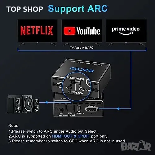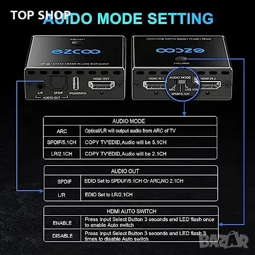 ✨【Лесно използване на ARC CEC EDID HDMI Extractor】Поддържа настройката ARC CEC EDID. Свържете Type-C кабела от USB 5V1A Просто свържете HDMI източник с входен порт и HDMI приемно устройство с изходен порт през Gigig. Изборите на аудио режим ARC, Optical и L/R ще пуснат телевизионни приложения без CEC.AUDIO SELECT SPDIF/5.1CH, COPY TV'EDID, аудиото ще бъде 5.1CH CEC. Изберете аудио режим L/R/2.1CH, COPY TV' EDID, аудиото ще бъде 2.1CH CEC