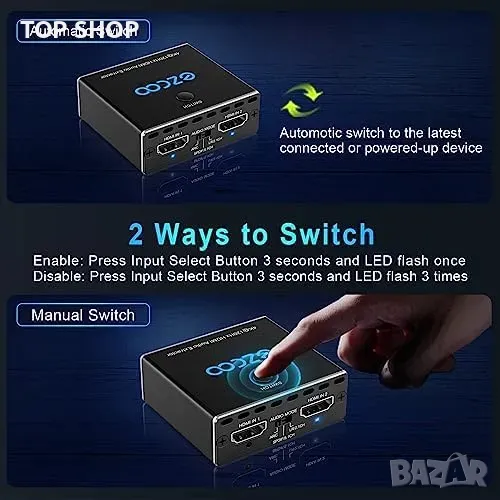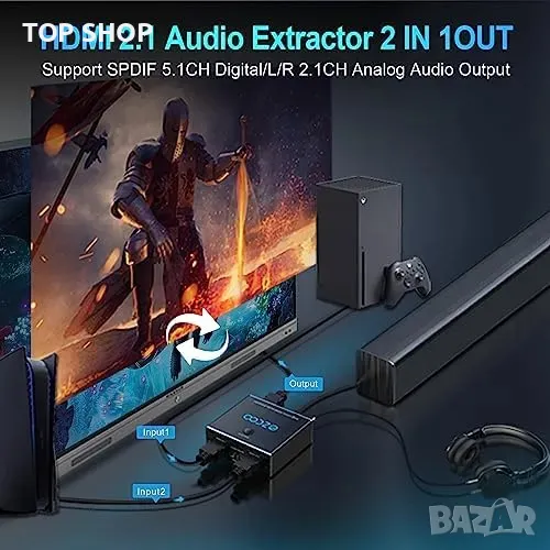 HDMI 2.1 4K 120Hz 2x1 Audio Extractor】2 порта HDMI 2.1 2 в 1 Audio Extractor лесно споделя видео и аудио от 2 различни HDMI източника с 1 HDMI дисплей. Можете лесно да свържете външни високоговорители, усилватели, звукови ленти и приемници към вашата система за филми/игри чрез HDMI (7.1CH аудио)/оптичен/3,5 мм. Добавяне на портове добавяне на портове отнема в C ARC Превключване с бутон