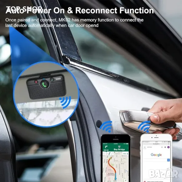Автоматично включване и повторно свързване : Сензор за вибрационно движение поддържа автоматично включване и повторно свързване към вашия сдвоен телефон, когато отворите вратата на колата.