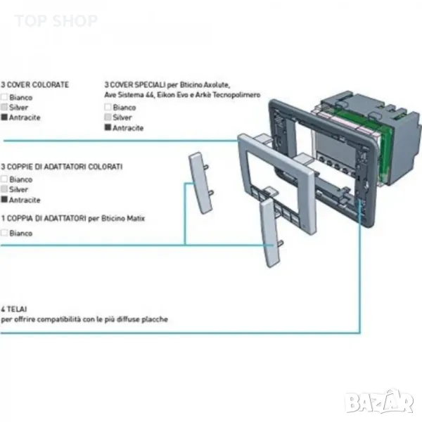 Описание Електронен термостат с микропроцесор, със седмично програмиране за управление на отоплението и klimaanlagen. CH121 работи с 2 AAA алкални батерии AAA 1,5 V без електрически връзки в линията. Комплектът съдържа: – 3 цветни капака в бял цвят, сребро, въглен сиво – 3 специални капака за Bticino Axolute и Ave система 44 бяло, сребристо, въглен сиво – 3 чифта адаптери, оцветени в бяло, сребристо, въглен сиво, 1 чифт адаптери за Bticino Matix White – 2 Рамка за съвместимост с плака на повечето производители разполага с контакти за носеща способност 5 (3) a 250 VCA. Захранване Няма електрически връзки в диапазона с 2 AAA алкални AAA 1,5 V батерии за ch121. Микроразкъсване (1BU). Контактно превключване без напрежение. Дисплей LCD смесен: графична карта, символи LED подсветка (синьо) избор на живот на подсветката. Диапазон на показване на температурата в Целзий или Фаренхайт. Максимална околна температура 45 °C Диференциалът може да се регулира. Степен на защита: IP20.. Разпоредбите и Genehmigungen отговарят на EN 60730 – 2 9 дизайнът подлежи на лицензионни възнаграждения, като същевременно позволява леки технически аксесоари и следните плочи: Bticino living International и тънки Bticino Light Cable Ties Bticino Axolute Bticino Matix VIMAR идея и Rondò VIMAR Plana и eikon gewiss Chorus one, Lux, Ave system 45, Banquise, noir, blanc, yes Ave system 44 Zamak, personal Legrand Cross, Rah, Vela Round