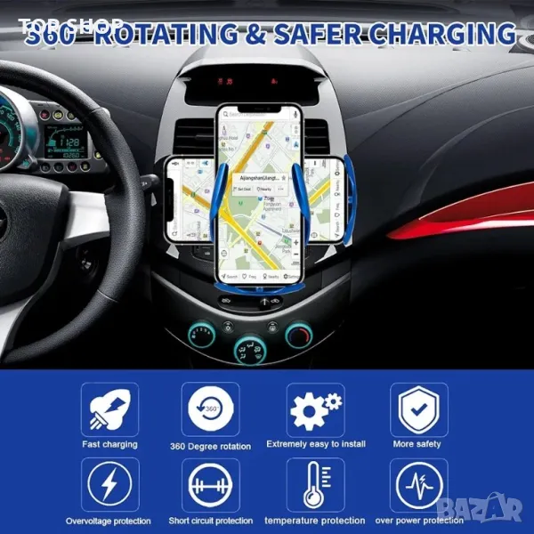 Въртящ се държач за телефон с вентилационен отвор и регулируеми крачета: Стойка за телефон за кола с безжично зареждане с въртяща се на 360 градуса топка ви помага да намерите най-подходящия ъгъл за безопасно шофиране. Поставете телефона близо до безжичното зарядно устройство за вентилационен отвор, инфрачервеният сензор в долната част ще освободи щипките автоматично и ще държи телефона здраво, хоризонтално и вертикално свободно превключване на мобилния телефон. Държачът за зарядно за кола може лесно да се прикрепи към повечето вентилационни отвори.