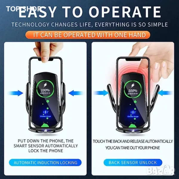 Интелигентно автоматично разпознаване: Безжичното зарядно устройство за телефон за кола използва интелигентна технология за сензор за гравитация, може да работи с една ръка. Този държач за телефон за кола се отваря и стои нормално без окабеляване, може да отвори договора 1000 пъти, в режим на готовност 30 дни. Просто докоснете сензорната зона и рамената ще се отворят автоматично, можете да извадите телефона, просто поставете телефона върху безжичното зарядно устройство за кола.