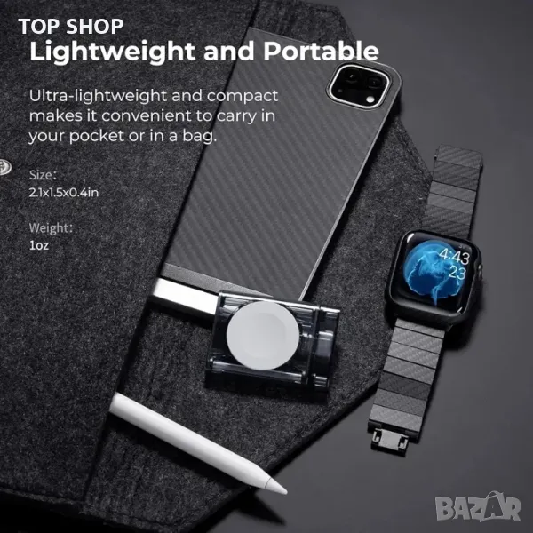 Леко и компактно: С тегло само 1 унция с преносим размер (2,1 x 1,5 x 0,4 инча), това магнитно безжично зарядно устройство за Apple Watch лесно се побира в джоб или чанта. Неговият уникален сив прозрачен дизайн ви позволява да видите вътрешната работа на ключалката.