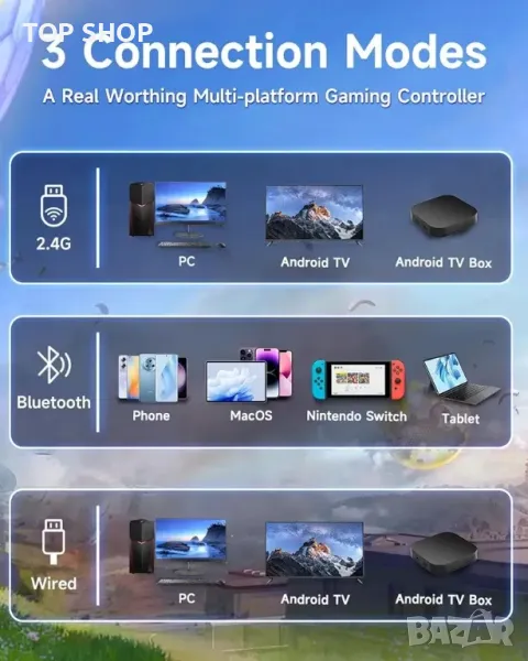 ?【Универсална съвместимост】Нашият контролер е проектиран да бъде съвместим с множество платформи, включително PC, Switch, iOS и Android. Независимо на кое устройство предпочитате да играете, нашият контролер осигурява безпроблемна свързаност и плавен геймплей на множество платформи, осигурявайки гъвкавост и комфорт.