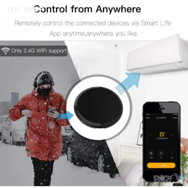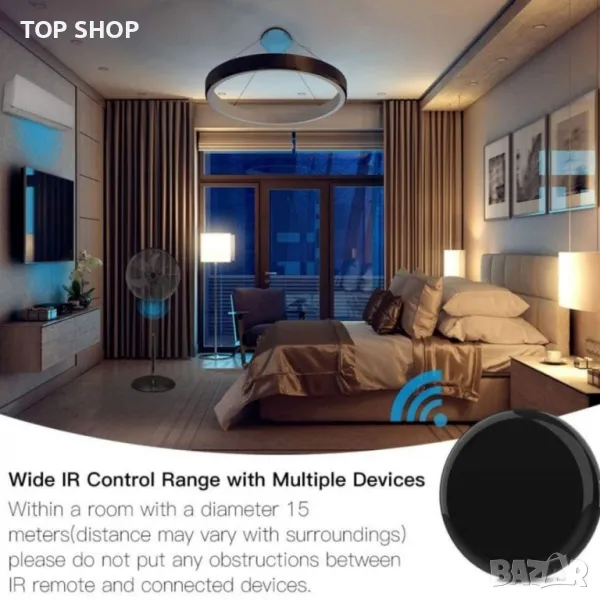 инфрачервен хъб за дистанционно управление активира климатици, телевизори, вентилатори, медийни плейъри, декодери и други; поддържа само IR (38K kHz); RF не е включен