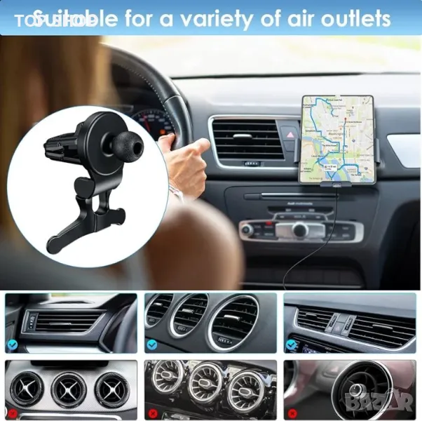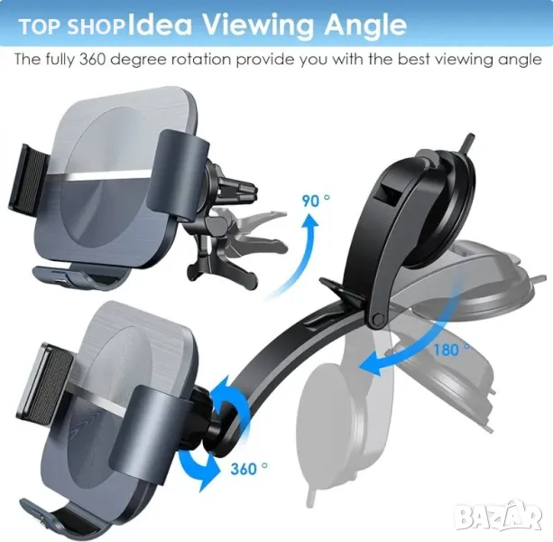 Двоен монтаж - 2 вида държачи за телефон. Държачът за безжично зарядно за кола бързо зарядно устройство може да бъде здраво закрепен към предното стъкло, таблото и масата със здравата вендуза. Може да се монтира и на вентилационния отвор със скобата за вентилация. Завъртане на 360 градуса и регулиране на ъгъла, регулиране на ъгъла от две части позволява оптимално гледане и по-лесно използване на функциите