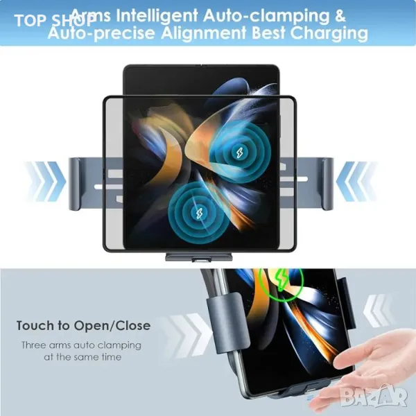 Интелигентно автоматично затягане - Натиснете бутона за освобождаване на държача за безжичната слушалка и той се отваря автоматично, захваща телефона ви и започва да се зарежда. Това Qi безжично зарядно устройство с вграден интелигентен чип може да защити телефона ви от презареждане, свръхток, късо съединение, прегряване и т.н.