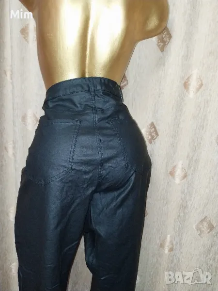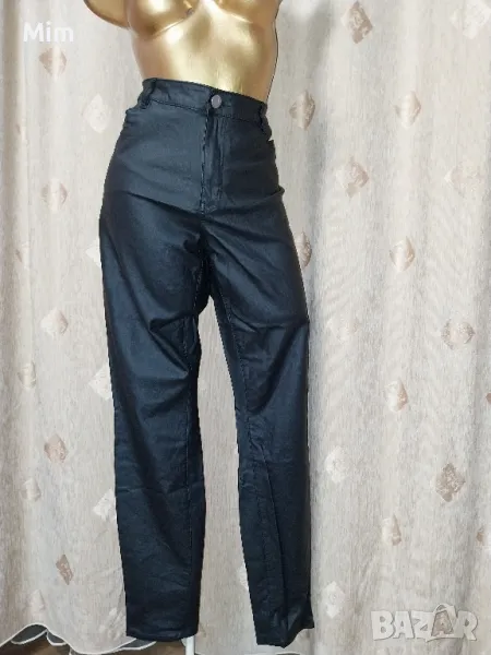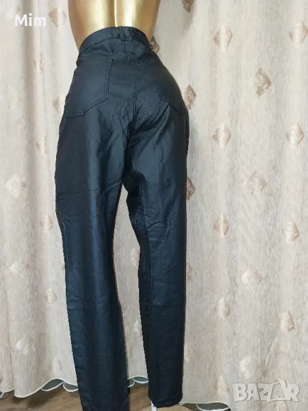 Черен еластичен панталон/ клин / промазка/ с джобове отпред и отзад закопчаването е с цип отпред и копче в талията с колан от 50 до 60 см едностранно, ханш 60 до 65 см едностранно, дълбочина 40 см ,широчина на крачола 16 до 19 см едностранно, Няма забележки.