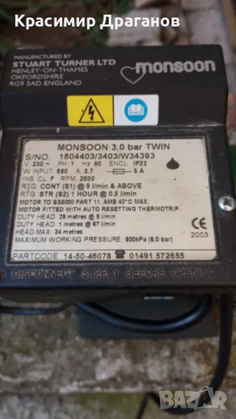 Stuart Turner Monsoon 46078 е хидрофорна помпа за душ с положителна глава, използвана за увеличаване на водното налягане в гравитационно захранвана система за топла вода. С вградени температурни датчици за работа на празен ход.
