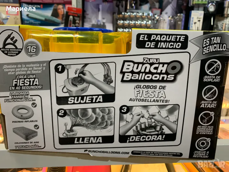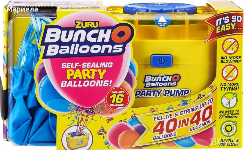 С комплекта Bunch O Balloons никога повече няма да се налага да духате или завързвате балоните с панделка или връв. Балоните го правят сами. Просто поставете електрическата помпа, включете помпата и за нула време ще имате перфектно напълнени балони, които можете да използвате веднага.