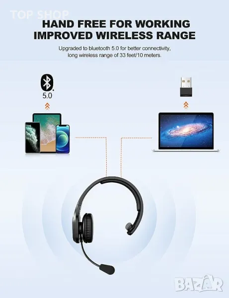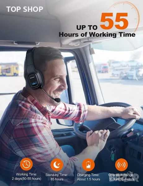 55 Ч. ВРЕМЕ НА РАБОТА И СВЪРЗВАНЕ НА 2 BLUETOOTH УСТРОЙСТВА ЕДНОВРЕМЕННО: Bluetooth слушалките TECKNET Trucker с микрофон осигуряват до 2 дни време за разговори и 85 часа в режим на готовност с едно зареждане. 1,5 часа пълно зареждане; осигурява пълна безжична свобода с работа от 33 фута