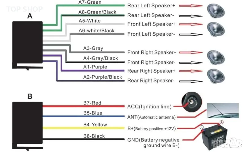 【Радиостанция】FM тунер: 4x65W, FM тунерът лесно приема всички радиостанции. Радиочестота: 87,5 MHz - 108 MHz, могат да се запаметят 12 станции. И с помощта на независимо IC радио, внесено от Тайван, което гарантира стабилността на радиочестотата. (Забележка: Функция за запазване на станцията с памет: жълтата линия на радиото трябва да бъде свързана към захранващата линия на автомобила.)