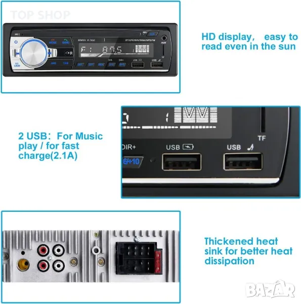 Поддържа се USB / AUX / TF: радиото има 2 USB порта, един за зареждане на мобилни телефони или други мобилни устройства, други за възпроизвеждане на музика. Портът за зареждане е 2.1A, което е 50% по-бързо от нормалните зарядни устройства. Освен това радиото за кола поддържа и TF карта (максимум 32GB) и AUX за възпроизвеждане на музика. Радиото поддържа аудио форматите MP3/WMA/WAV/FLAC.