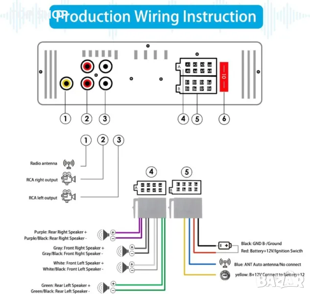 Съдържание на кутията: радио за кола x 1, адаптер за антена x 1, дистанционно управление на волана x 1, ръководство за употреба x 1