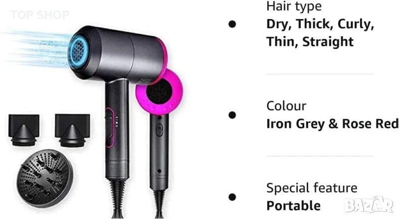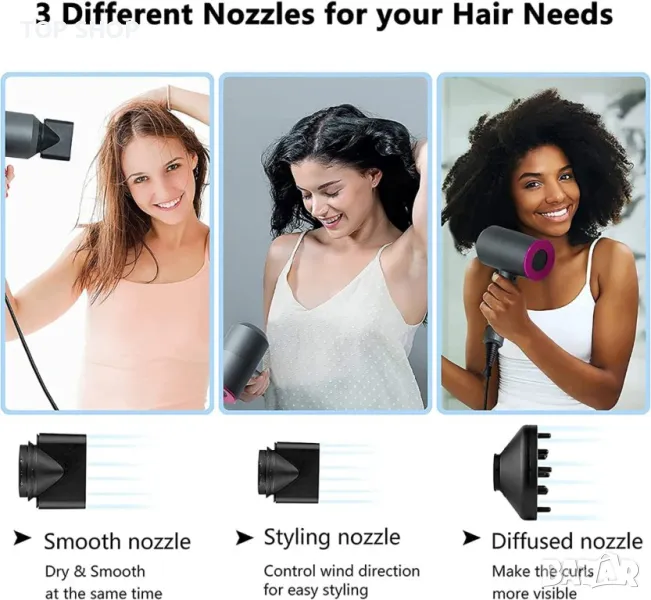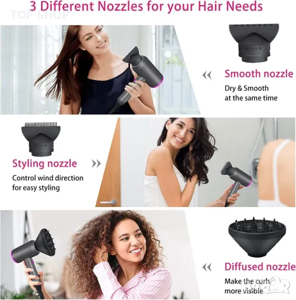【Включени са 2 концентратора и дифузера】има три вида резервни дюзи: гладки дюзи, дюзи с четки и дюзи за дифузьор. Концентраторът е идеален за прецизно оформяне на прав, фокусиран върху дифузера въздушен поток, който помага да се дефинират естествените къдрици и вълни на косата, за да се създаде пухкава прическа
